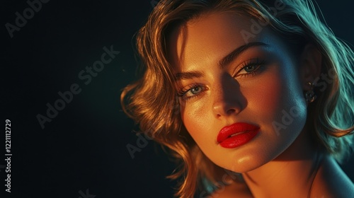 woman, portrait, beauty, face, hair, model, blond, gold, light, shadow, lip, red, make-up, skin, eye, blue, eyelash, eyebrow, cheekbones, neck, shoulder, earring, style, fashion, glamour, elegant, sensual, attractive, gorgeous, stunning, expressive, captivating, sophisticated, chic, classic, timeless, warm, vibrant, dramatic, artistic, photo, image