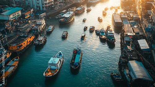 Golden Hour Boats Docked Along Busy River City