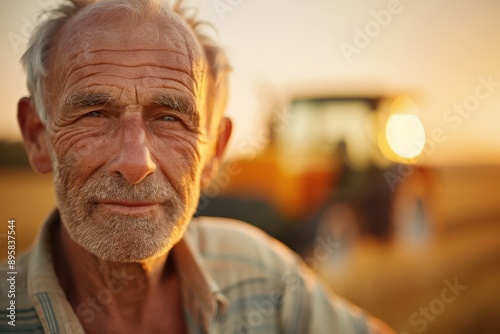 Golden Hour Close-Up Portrait of Farmer in Field with Tractor Background