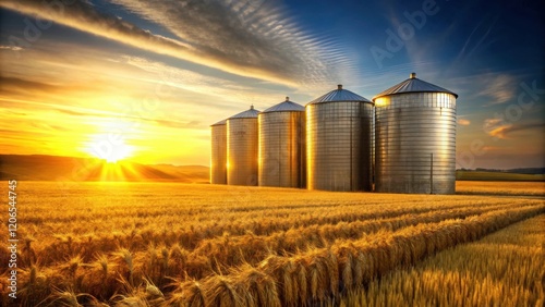 Golden Hour Harvest Four Silos Stand Tall in a Field of Ripe Grain at Sunset