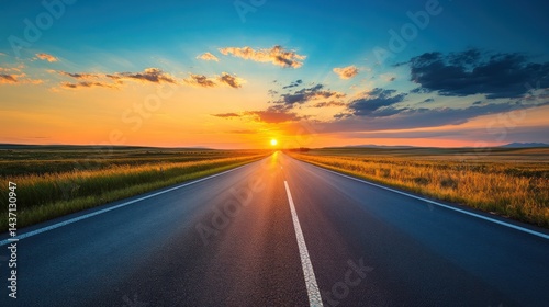 Golden hour highway: A sun-kissed road stretching towards the horizon under a vibrant sky