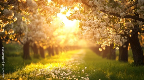 blossom, spring, fruit farm, sunset, tree, flower, gold, sunlight, nature, garden, bloom, sunshine, peaceful, serenity, tranquil, calm, light, beauty, flora, landscape, scenery, field, grass, white, yellow, green, floral, daisy, countryside, idylli, charming, rustic, vibrant, bright, warm, sun, day, atmosphere, scene, path