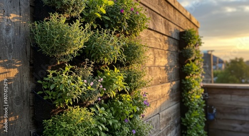 Golden Hour Light On Rooftop Vertical Garden With Wooden Wall