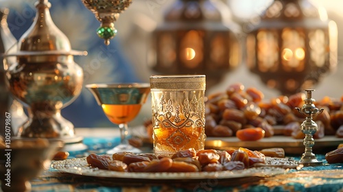 date, tea, lantern, ramadan, islam, muslim, food, drink, gold, hours, sunlight, warm, light, sweet, delicious, culture, tradition, religious, festival, celebration, evening, ambience, cosy, comfort, serenity, peace, spiritual, holy, month, fasting, break, arab, middle, east, morocco, ornament, glasses, metal