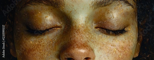woman, face, closeup, eyes closed, freckle, gold, gold, dust, sparkle, serene, peaceful, calm, tranquil, beauty, skin, texture, natural, aethereal, magical, mystical, dreamy, soft, delicate, feminine, elegance, luxury, golden hour, sunlight, light, shadow, portrait, artistic, model, make-up, cosmetic, skincare, spa, wellness, relaxation, meditation, mindfulness, inner peace, spiritual, golden light, detailed, hi-res