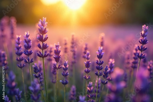 Golden hour sunlight bathes a field of lavender, creating a dreamy, hazy, and romantic atmosphere Perfect for relaxation, spa, and beauty themes , aroma, twilight