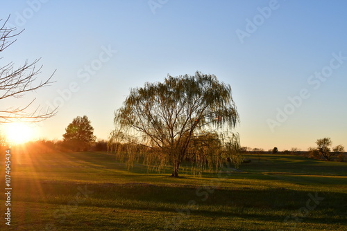 gold, sunset, evening, sky, landscape, summer, autumn, fall, green, sundown, dusk, golden hour, sunlight, sunshine, willow tree, weeping willow, willow, nature, grass, field, tree, meadow, sun, season, rural, spring, sunrise, morning