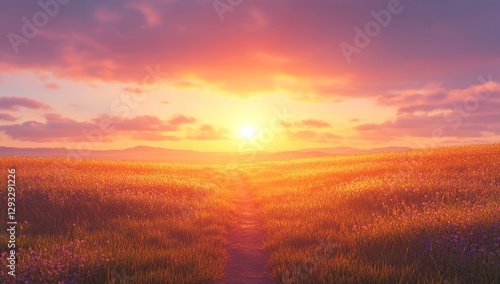 Golden Hour Sunset: Path Through a Vibrant Wildflower Meadow, Serene Landscape with Tranquil Skies