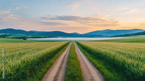 Golden hour sunset peace over tranquil meadow with misty silhouette concept. Scenic dirt road through lush fields and rolling hills at sunset.