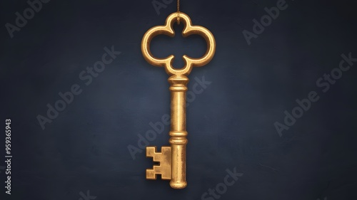 Golden Key Hanging on Blue Background