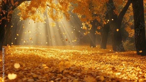 Golden leaves blanket the forest floor as sunlight filters through the trees in this picturesque autumn scene