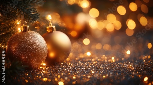 Golden LED lights reflecting off holiday ornaments, creating a cozy, warm glow
