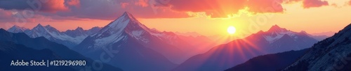Golden light crests jagged peaks, painting sky vibrant hues, spectacular, horizon