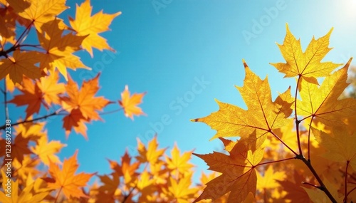 Golden maple leaves against a bright blue sky, green, maple leaves, fall
