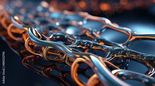 Golden metallic links weave complexly, their polished surface reflecting light, set against a deep blue backdrop with soft lighting, generative ai