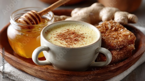 Golden Milk Latte with Ginger, Honey and Coconut Dessert on Wooden Tray