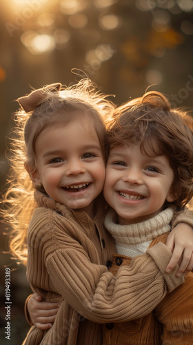 children, sibling, hug, smile, happiness, joy, love, friendship, autumn, sunlight, warmth, bonding, togetherness, nature, candid, young, adorable, cute, hugs, fall, gold, leaf, innocent, cheerful, playful, park, tree, cosy, childhood, carefree, knitwear, sweater, glowing, innocence, sunny, happy, hair, closeness, brown, family, fun, laughter, light, tender, harmony