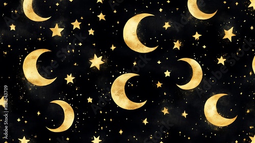 moon, star, night, sky, gold, gold, crescent, pattern, background, texture, celestial, cosmic, space, universe, galaxy, sparkle, glistering, shimmer, shine, elegant, luxury, dark, black, design, art, illustration, aesthetic, magical, mystical, dreamy, romantic, beautiful, abstract, wallpaper, textile, fabric, print, repeat