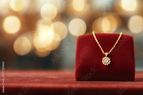 necklace, gold, diamond, pendant, jewellery, elegant, display, red, velvet, luxury, sophistication, chain, sparkle, glamour, fashion, accessory, precious, gift, celebration, special, occasion, style, design, beauty, brilliance, expensive, wealth, present, surprise, romance, love, proposal, engagement, wedding, background, bokeh, blurred, empty, space, product, shiny, gemstone, decoration, glamourous, bright, crystal, beautiful, ornament, closeup