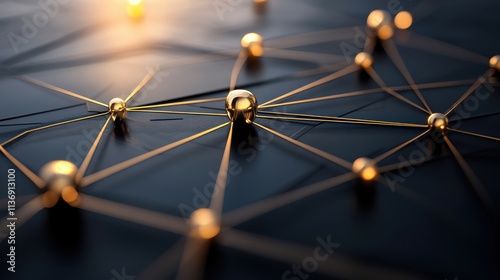 Golden network connections with metallic spheres and glowing lines on a dark surface.