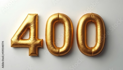 Golden number 400 balloons float on white background. Metallic, shiny digits symbolize achievement, celebration, success. Use luxury graphic for anniversaries, milestones, counting success in