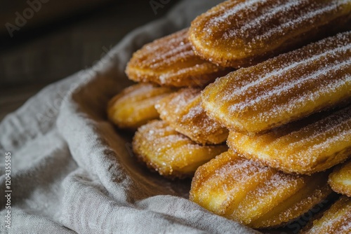 Golden pastries stacked in cozy basket, dusted with sugar, invit