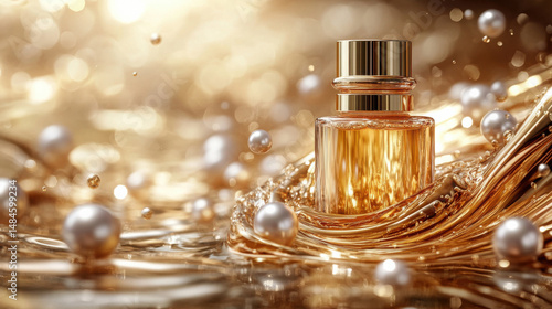 Golden perfume bottle surrounded by shimmering pearls and swirling liquid in an enchanting display of luxury and elegance