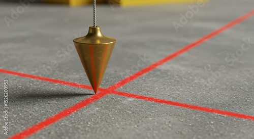 Golden plumb bob precisely aligned over red chalk cross mark on concrete floor. Construction tool for vertical accuracy and measurement. Concept of precision in building projects.