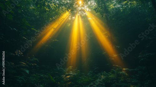 Golden Rays of Sunlight Filtering Through Trees in a Serene Green Forest Tranquil Nature Photography