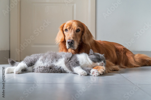 intimacy, companion, animal, friendly, friendship, adorable, mammal, floor, pet, indoor, family, kitten, funny, friends, hair, dog, cat, lying down, golden retriever, accompany