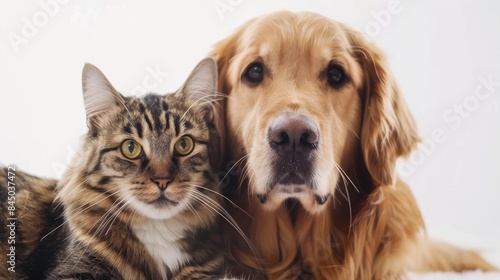 Golden retriever and cat portrait on white background