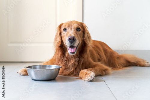 Golden Retriever and its dog bowl