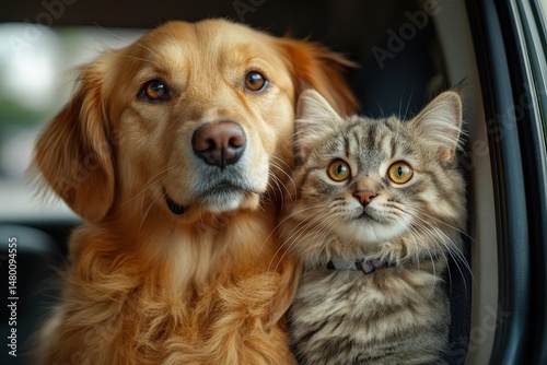 Golden Retriever and Tabby Cat Enjoy a Car Ride Together in the Sunlight During a Warm Afternoon Outing at a Pet Friendly Location