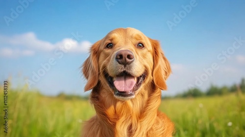 golden retriever displays a joyful expression while sitting in a vibrant green field. bright blue sky above and gentle clouds enhance the cheerful atmosphere