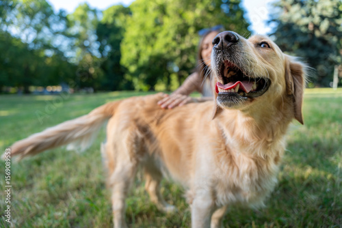 Golden retriever dog being petted by smiling woman in park reflecting friendship and joy during sunny day