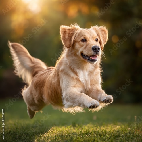 Golden retriever dog leaping joyfully through lush grass with glimmering sunlight reflecting on its beautiful fur