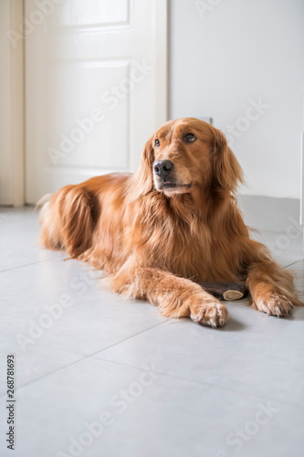 expression, mammal, pet, purebred dog, animal, dog, golden retriever, family, happy, looking, cute, hair, nobody, kneeling, indoor, looking up, bored, eye