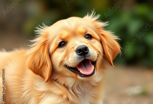 Golden retriever puppy, head tilted, playful expression, happy, adorable, fur, picture