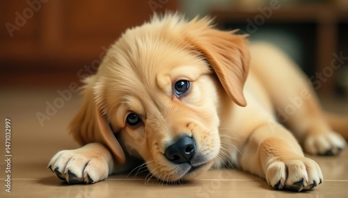 Golden Retriever puppy lies down, head tilted, playful expression, adorable, fur, happy