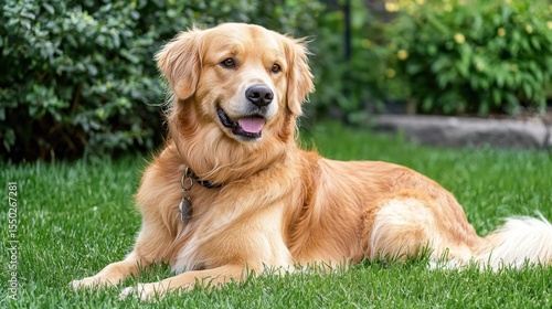 Golden retriever resting comfortably on green grass in the backyard during the daytime