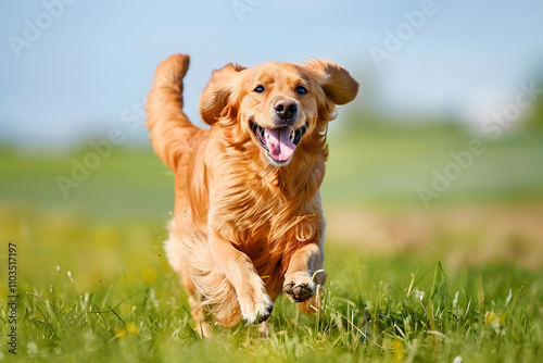 Golden Retriever Running Through Meadow on Sunny Day with Blue Sky and Green Grass