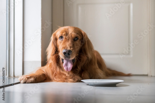expression, mammal, pet, yawn, floor, animal, dog, jacket, funny, family, golden retriever, look, cute, hound, nobody, kneeling, plate, food, indoor, tongue, interesting