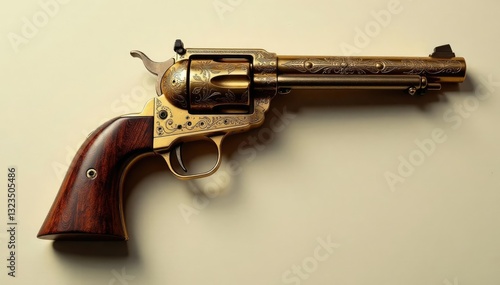 Golden revolver on a neutral background, highlighting the craftsmanship of its engravings, neutral, intricate engravings,