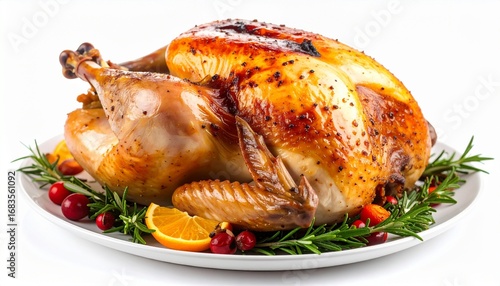 Golden roasted chicken whole bird with crispy skin juicy meat delicious holiday food isolated on white background