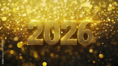 Golden slick metallic shiny numbers showing "2026" with a sleek reflective surface isolated on a blurred plain background creating a futuristic minimalistic vibe and inviting a sense of optimism and r