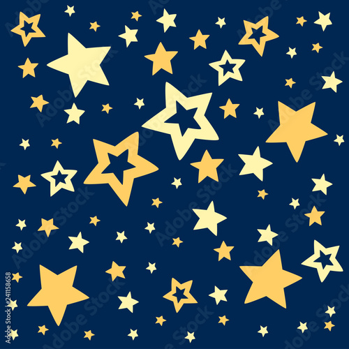Golden stars on dark blue sky background. Pattern with sky. Festival decor. Flat vector illustration