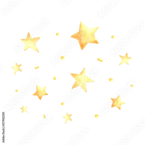 Golden stars with sparkle dots watercolor isolated illustration for kids design. Cute hand drawn midnights background with twinkling constellation. Template for baby print from fairy tale dreams theme