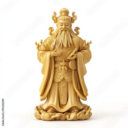 chinese culture, statue, sculpture, golden statue, art, traditional, ancient, history, mythical, god, deity, warrior, military, power, strength, wisdom, loyalty, justice, honour, spirituality, faith, belief, spirit, taoism, buddhism, chinese new year, asian culture, oriental, east asia, china, white background, isolated, illustration, artwork, religion