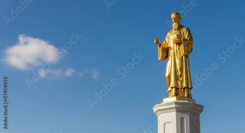 golden statue, man, figure, religious, historical, statue, sculpture, historical building, daylight, sky, blue skies, cloud, white cloud, pedestal, architecture, stone, tall, standing, gesture, illumination, sunny, brightness, exterior