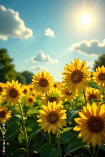 Golden sunflowers bask in bright sunlight, vibrant field , plants, leaves
